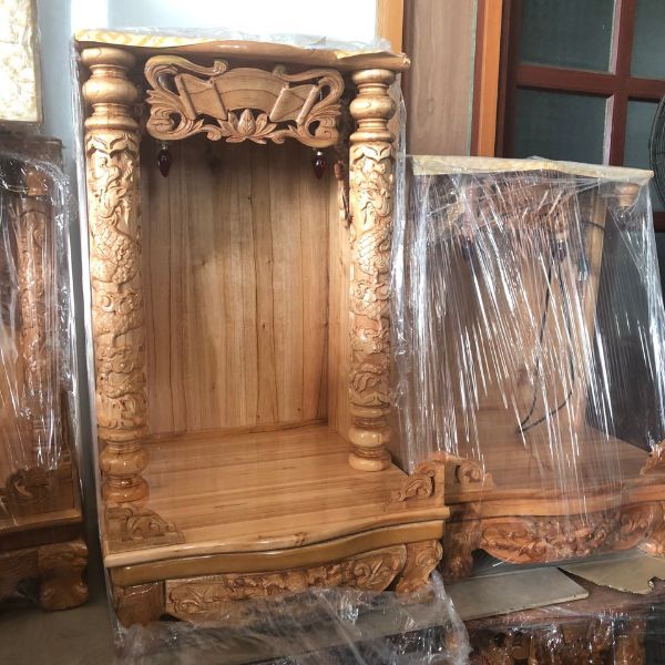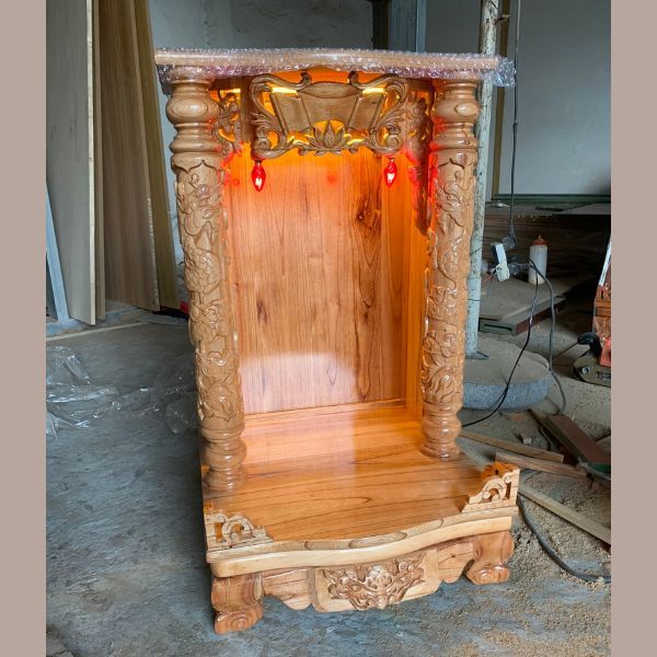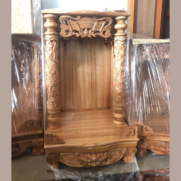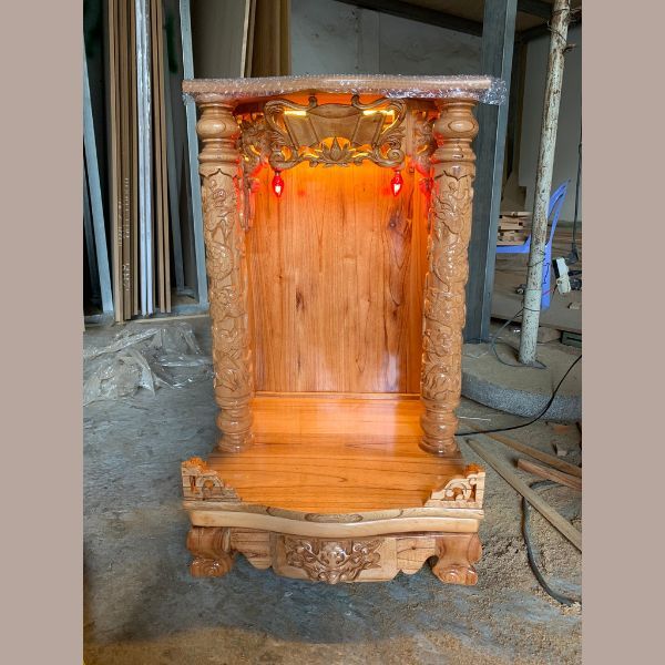 -Bàn thờ ông địa thần tài được làm từ nhiều chất liệu khác nhau như gỗ xoan đào, gỗ sồi hoặc căm xe