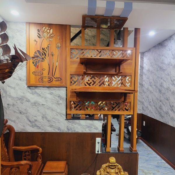 Vách ngăn cầu thang có bàn thờ thường được làm từ gỗ hoặc các vật liệu khác có tính thẩm mỹ cao .Bàn thờ có thể được trang trí với các họa tiết hoa văn, chữ cái hay hình ảnh tôn giáo tùy thuộc vào sở thích và tôn giáo của gia chủ.