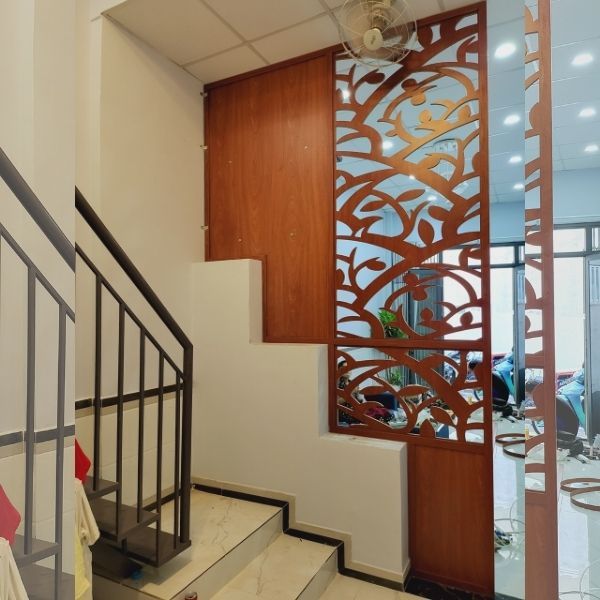 Vách ngăn cầu thang có bàn thờ thường được làm từ gỗ hoặc các vật liệu khác có tính thẩm mỹ cao .Bàn thờ có thể được trang trí với các họa tiết hoa văn, chữ cái hay hình ảnh tôn giáo tùy thuộc vào sở thích và tôn giáo của gia chủ.